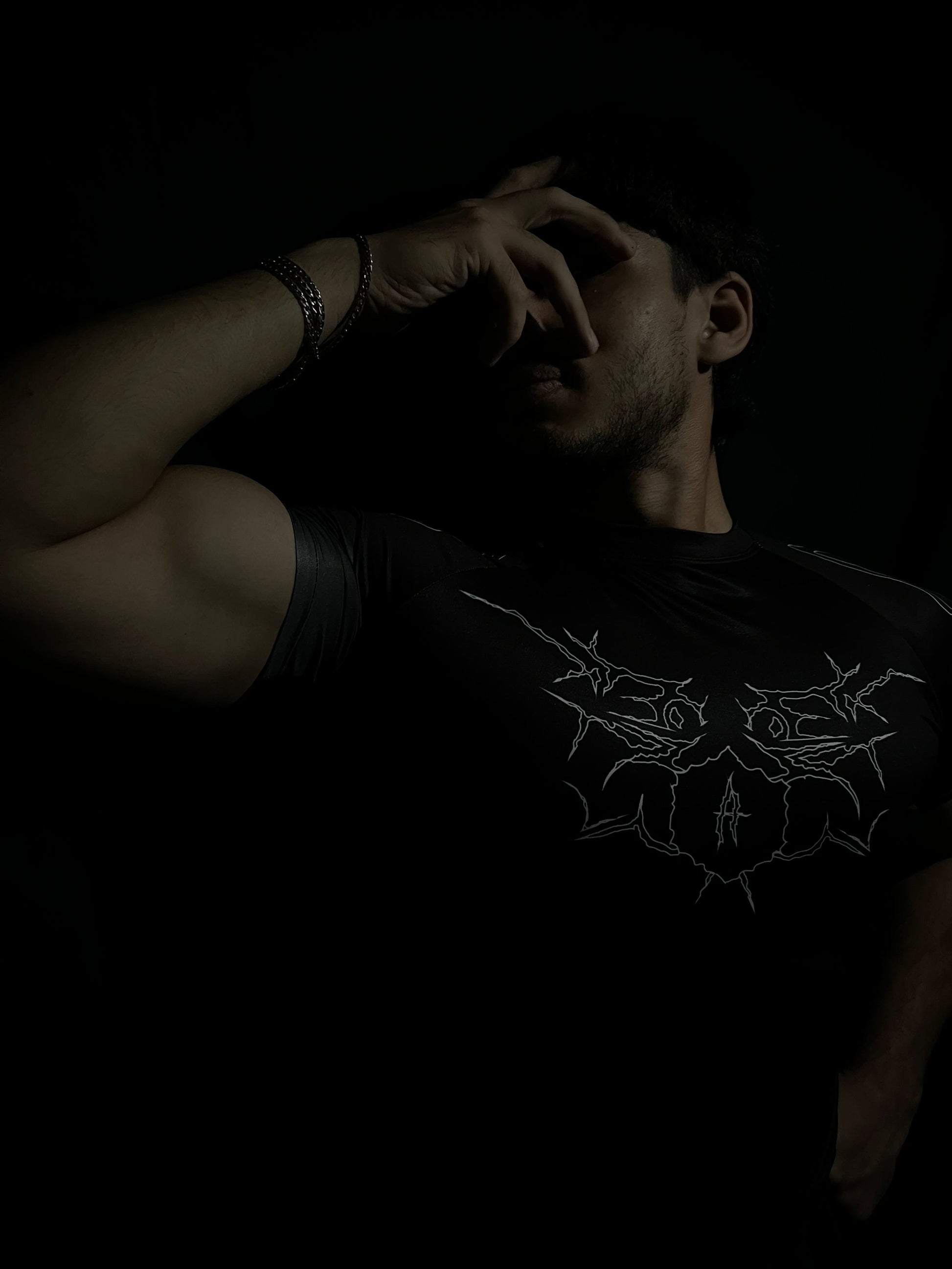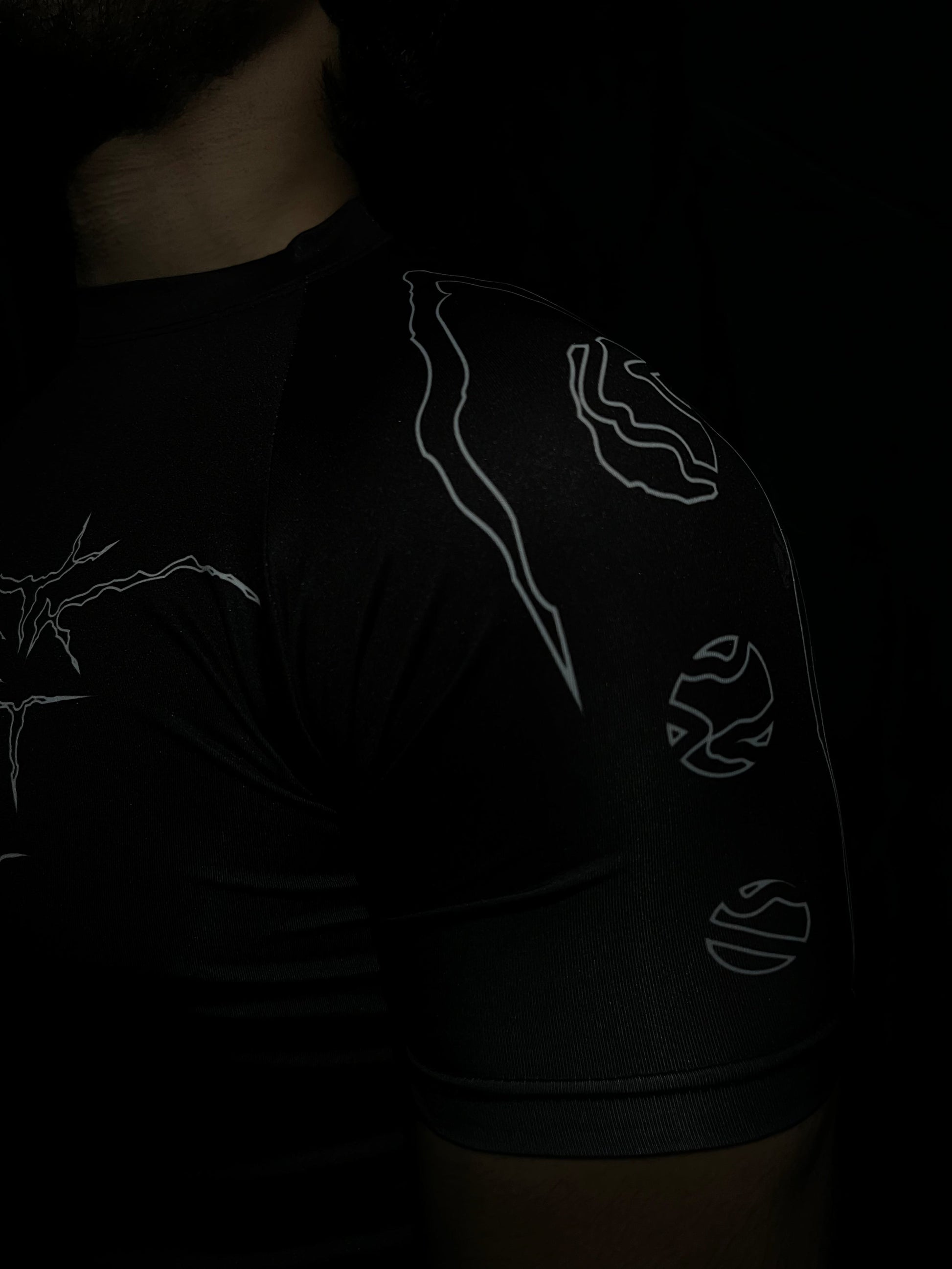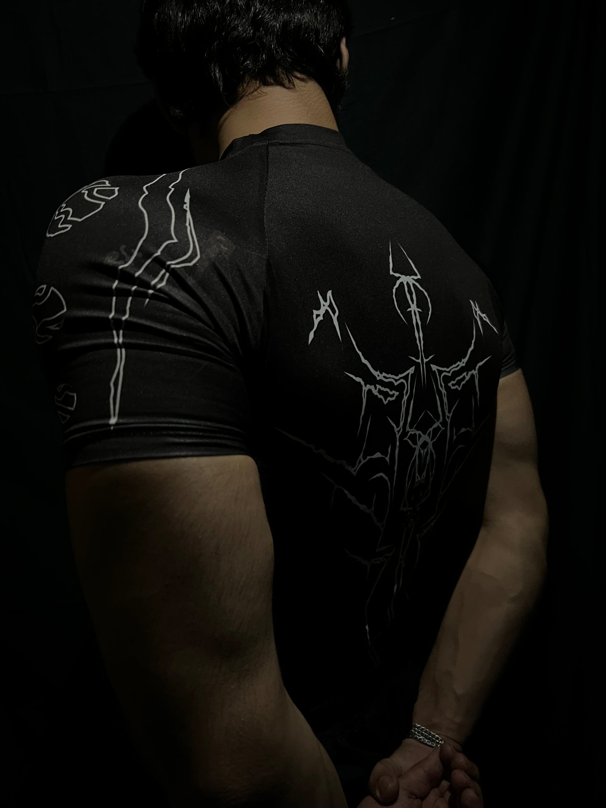 The Divine Mark channels the purity of light into a sharp, disciplined form. With crisp white designs slicing across the chest and shoulders and a bold, oversized emblem etched across the back, this piece is a symbol of silent authority — a reminder that power doesn't always scream; sometimes, it watches, waits, and strikes with precision.